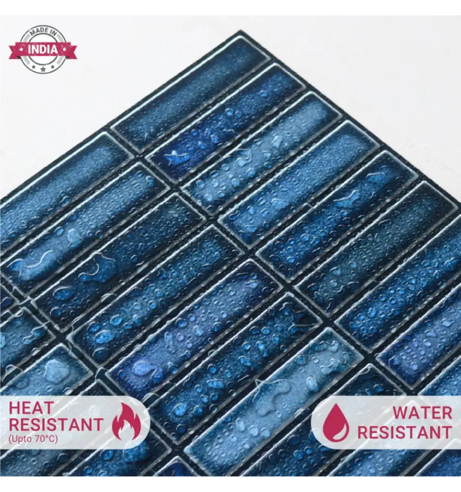 PROPERTIES: Mosaicowall peel & stick tiles exhibit properties like being waterproof, UV resistant, Resistant to heat, Stain-proof, and having a strong adhesive at the back